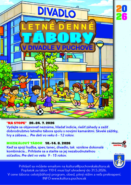 PÚCHOVSKÁ KULTÚRA, S.R.O. PÚCHOV ORGANIZUJE POČAS LETNÝCH PRÁZDNIN 2026 NASLEDOVNÉ DENNÉ TÁBORY OD 8.00 DO 15.00 H V DIVADLE V PÚCHOVE: