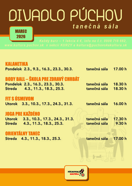Kurzy prebiehajú v budove Divadla v Púchove, tanečná sála na 1.poschodí, 1 vstup 4 €.